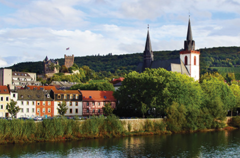 Flowers tumble from baskets lining streets of half-timbered houses, and lights glint off quiet canals. A mighty river carries ships and cargo through a landscape shaped by time and history. The spires of medieval churches and castles appear around each bend in the river, and vineyards climb the verdant hillsides.